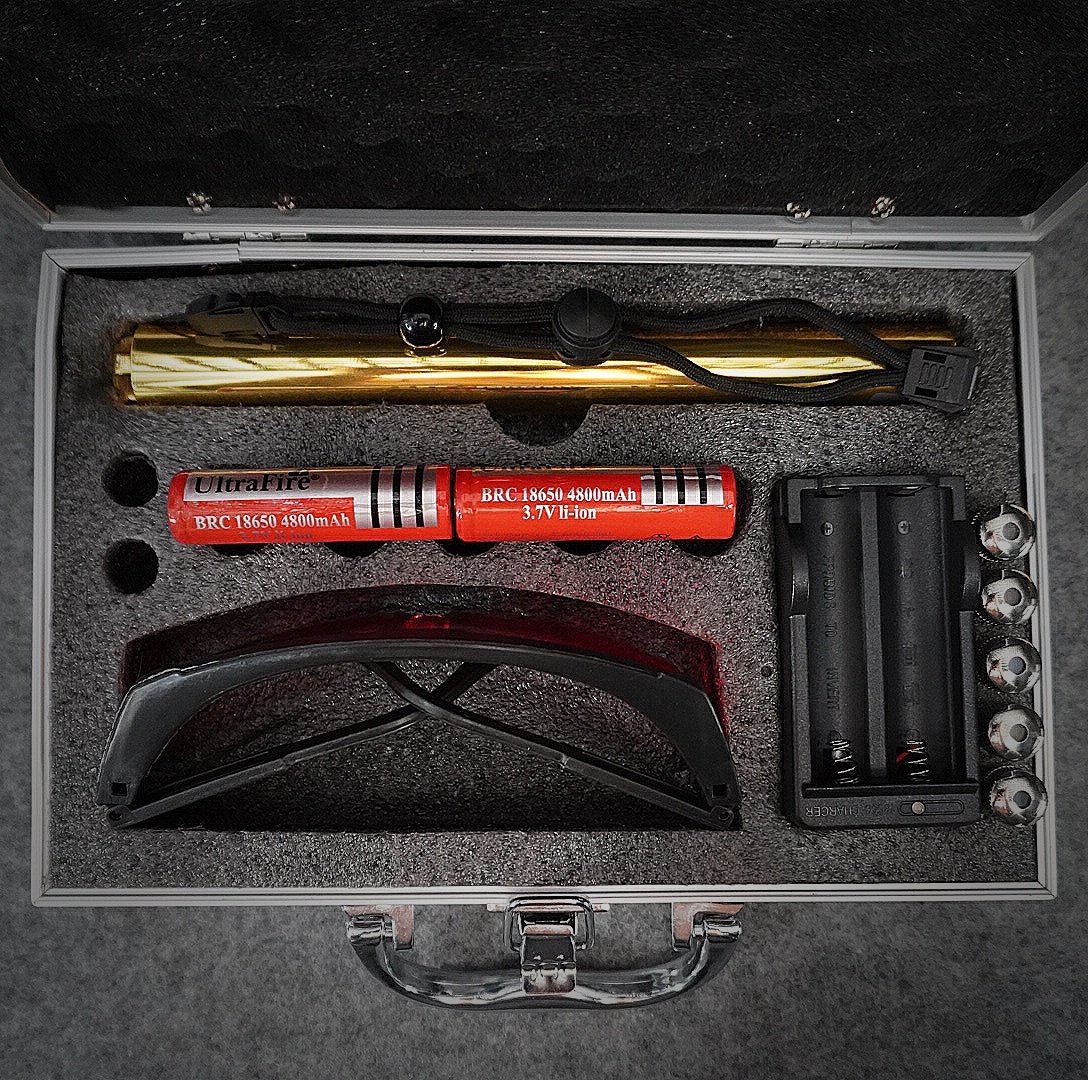 With solid pure copper case, the 500mw 520nm Burning Blue Laser pointer kits Golden 008, 500mw high power laser beam full of energy. You can use it to light a cigarette or paper by adjusting its focus. Contemporary sleek design looks trendy and cool in your hand. Featuring low power consumption, it uses two 18650 batteries to provide long hours of continuous run time. Additionally, the kit also includes a battery charger, a pair of glasses and a gift box. Don’t hesitate to get one now!